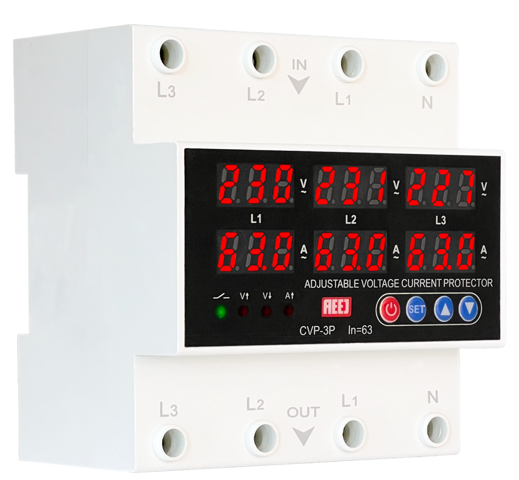 محافظ ولتاژ جریان سه فاز قابل تنظیم AEEJ، محافظ بسیار کامل و قابل تنظیمی است که ۴ محصول محافظ ولتاژ، رله کنترل بار، نمایشگر ولتاژ جریان سه فاز و CT را در خود جای داده است.